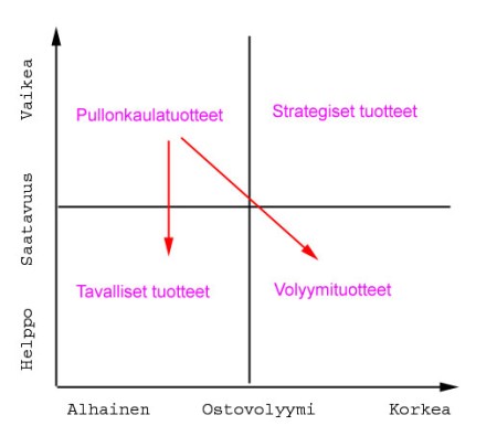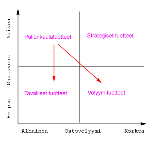 Oston perusteissa tuotteet jaetaan neljään kategoriaan kuvan mukaan. Pakkauksista ei pitäisi missään tilanteessa tulla pullonkaulatuotteita. Valitettavan usein näin kuitenkin on. Omassa työssäni törmään toistuvasti tällaisiin tilanteisiin. ReliDesin pakkaussuunnitteluosastolla tehdäänkin jatkuvasti suunnittelua, jossa on tavoitteena saada jokin tietty pakkaus pois pullonkaulakategoriasta.